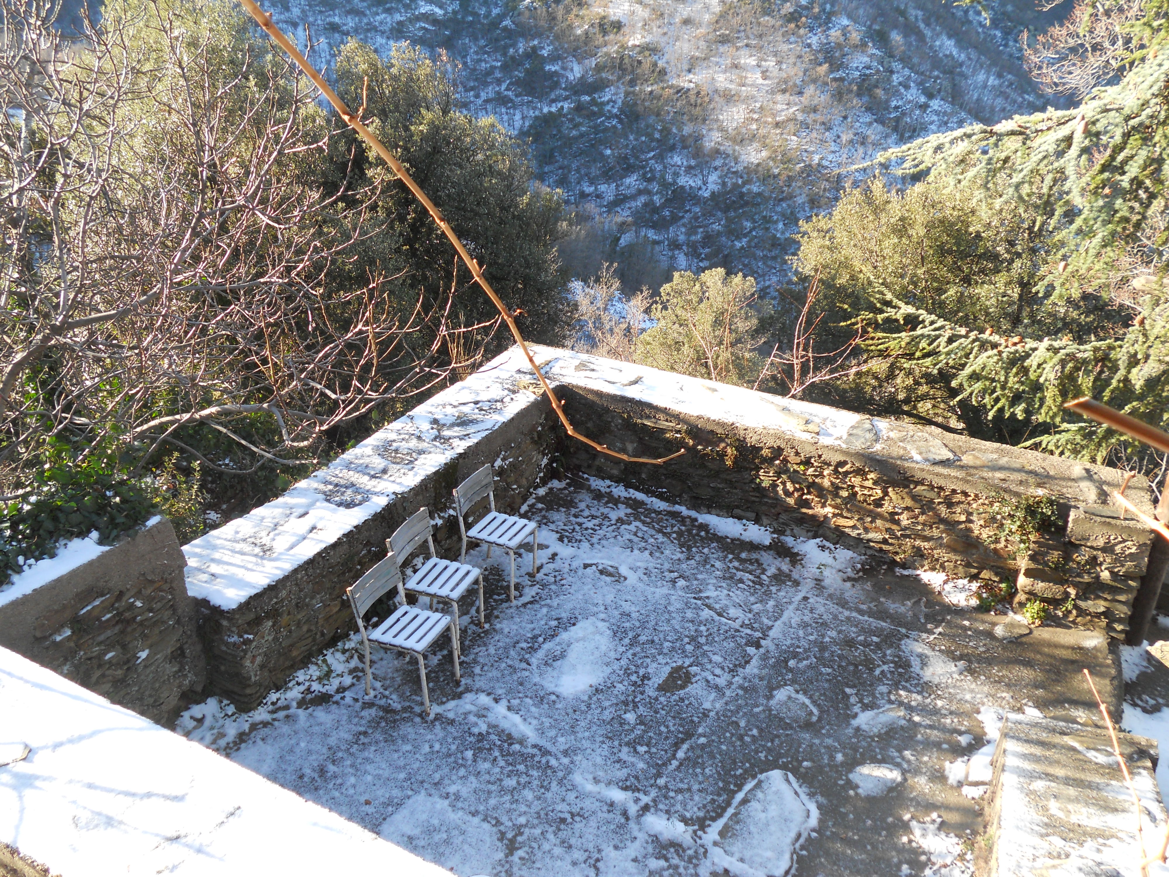 De seizoenen volgen elkaar hier in sneltempo op, en dan nog in de verkeerde volgorde. Eergisteren was het lente, vandaag weer putteke winter. Er ligt een laagje ijssneeuw, een hard en korrelig goedje. Sneeuw die van de Canigou naar hier is gewaaid, denk ik.