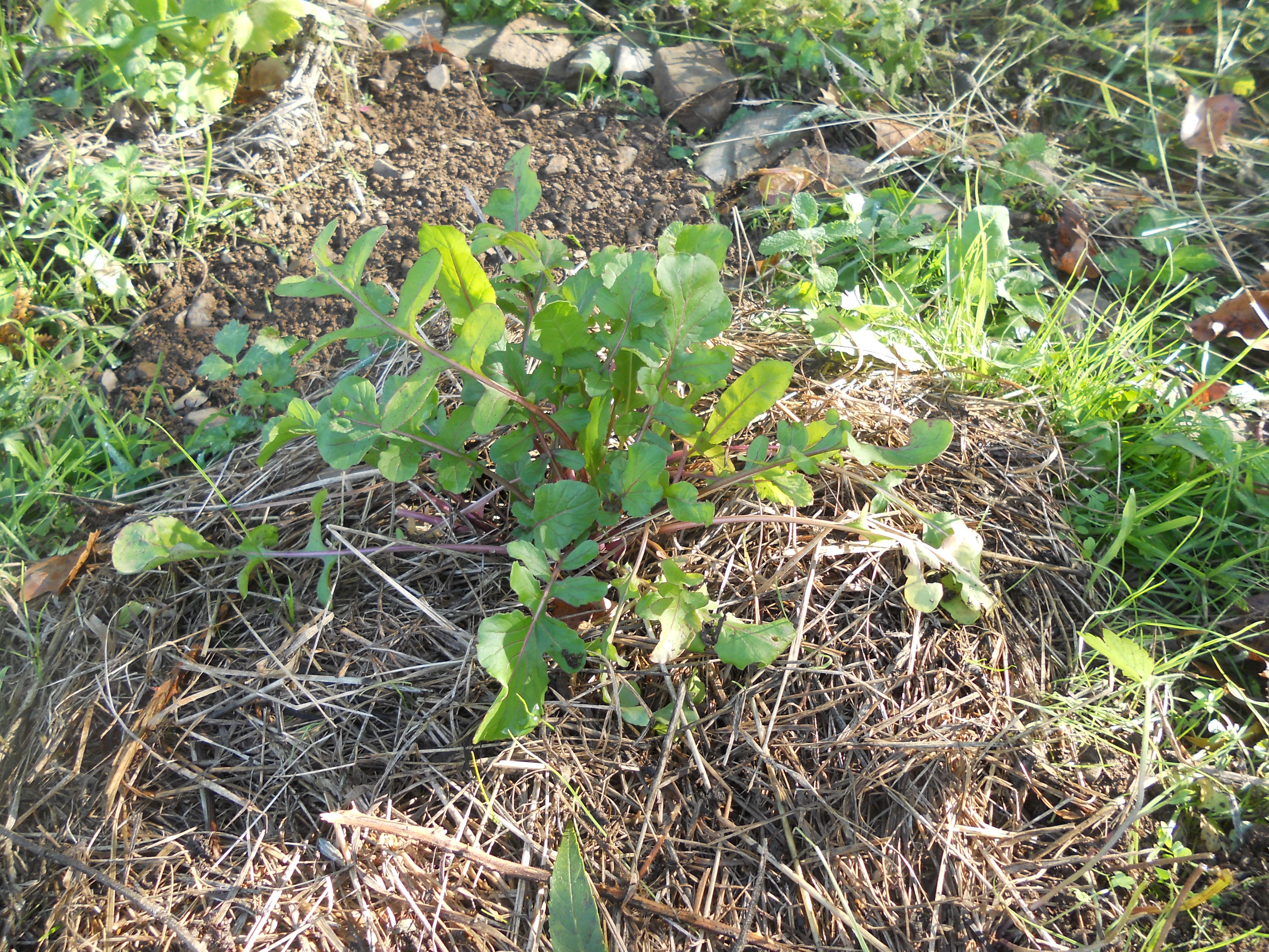 2. Onkruid mag blijven. De grond moet immers bedekt blijven. Hier en daar moet het wat ingetoomd worden en op de plekjes waar geplant of gezaaid wordt, moet het natuurlijk weg. Ik heb zelfs wat nieuw ‘onkruid’ toegevoegd: vogelmuur en wilde roquette, want het zijn goede bodembedekkers en nog lekker ook.