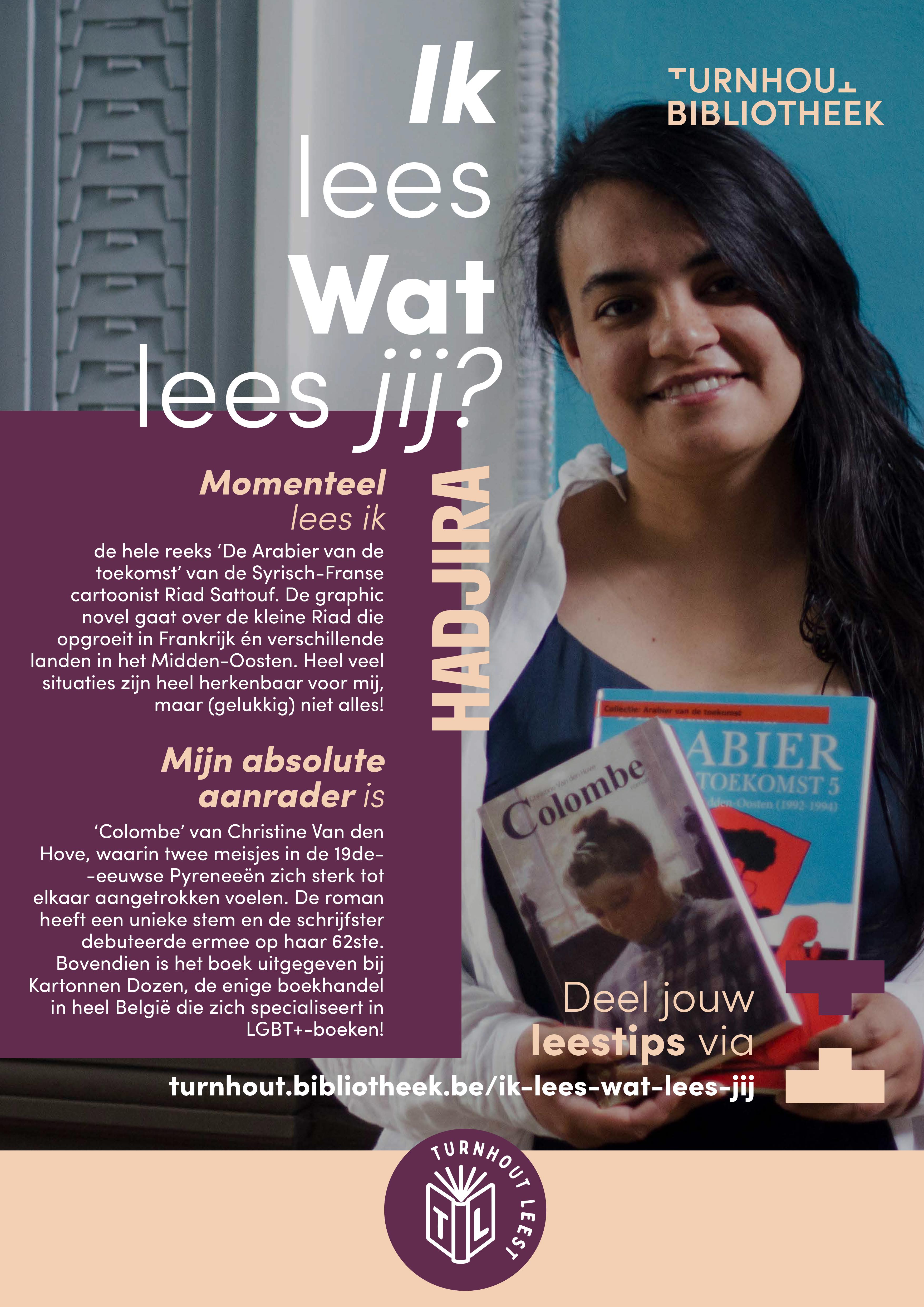 Een campagne van de Turnhoutse bibliotheek, waar Hadjira Hussain Khan, beloftevolle dichter en journalist, mijn roman Colombe aanraadt. Dank je wel, Hadjira!