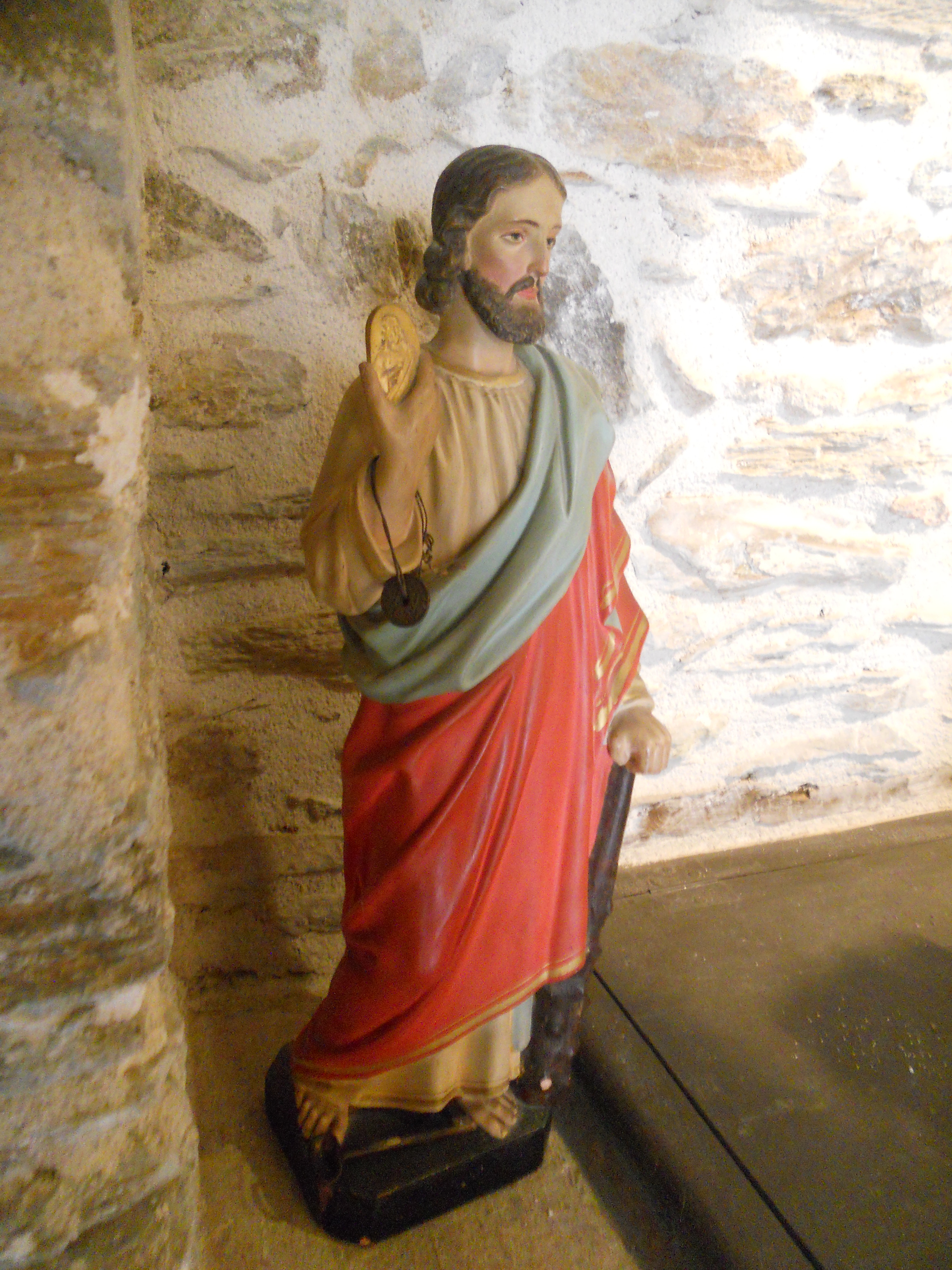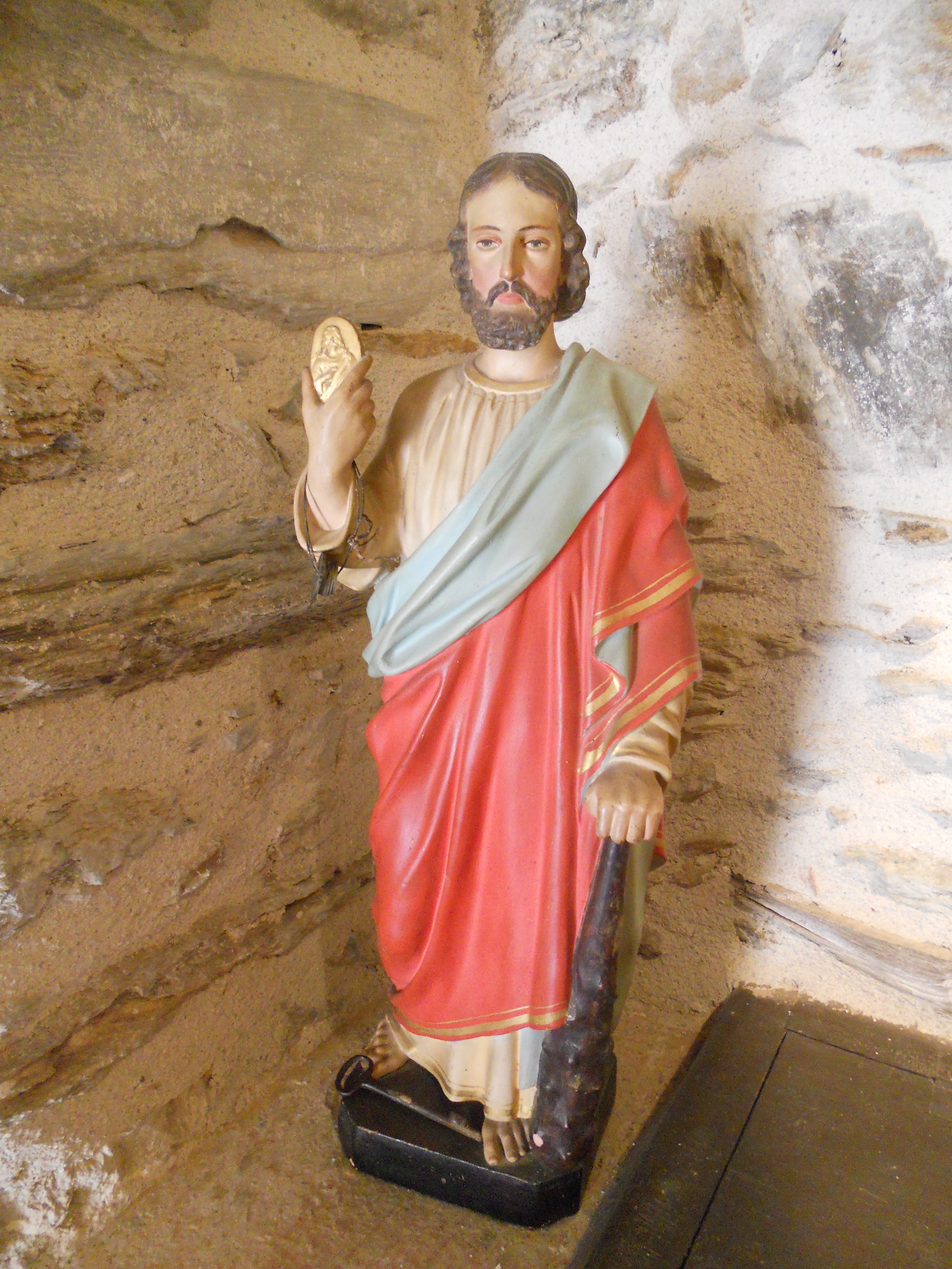 Deze mijnheer lijkt een beetje op Jezus en dat is niet toevallig. Het is Judas Taddeüs, een van de twaalf apostelen en hij zou familie van Jezus geweest zijn. Daar was hij blijkbaar fier op want hij wordt dikwijls afgebeeld met een prent van Jezus in zijn hand om de gelijkenis met zijn neef (of zelfs broer?) aan te tonen. Taddeüs betekent volgens de ene bron ‘de zachtaardige’, volgens de andere ‘de dappere’. In ieder geval was het de goede Judas en niet de andere, Judas Iskariot, die Jezus verraden heeft.