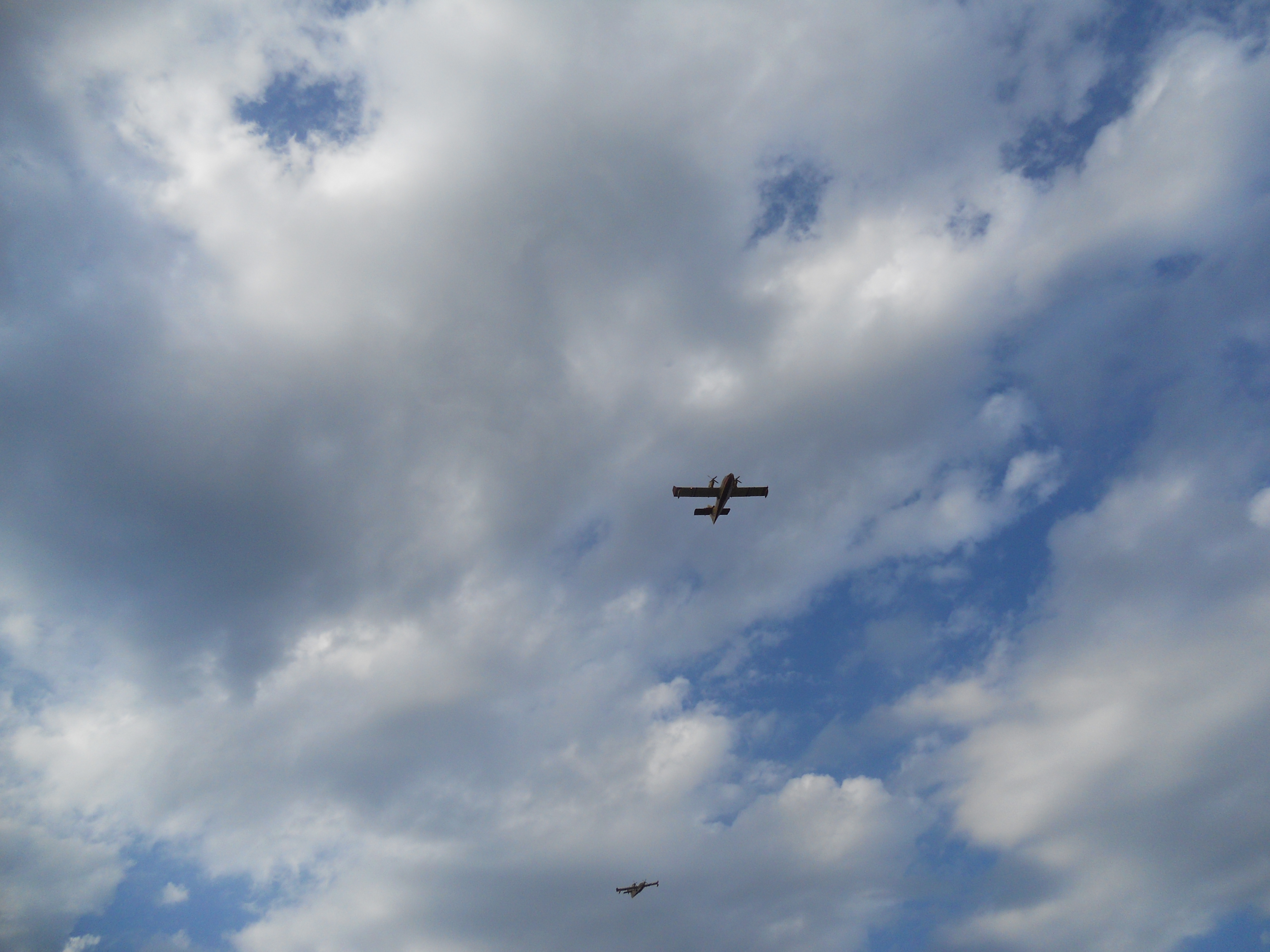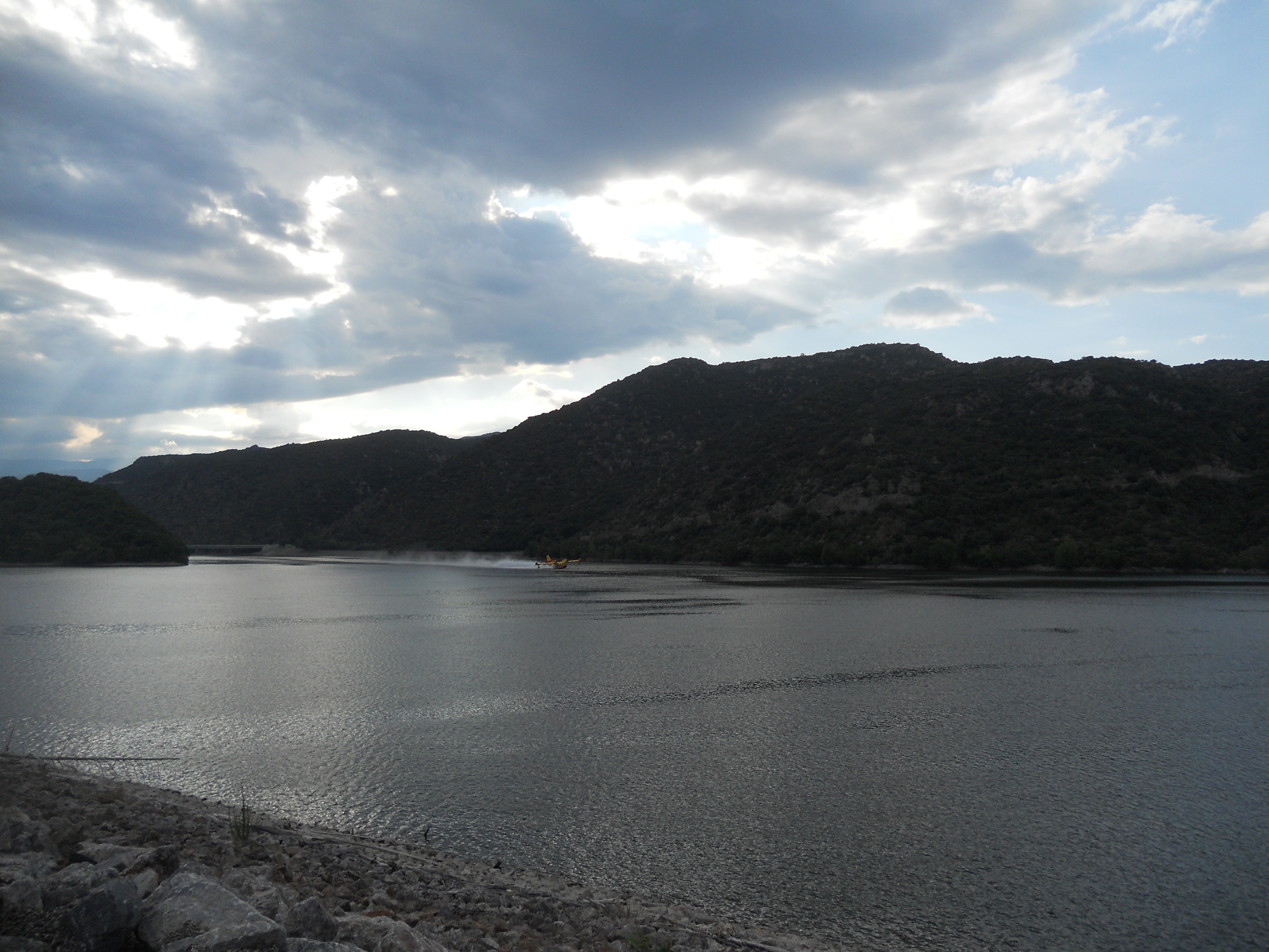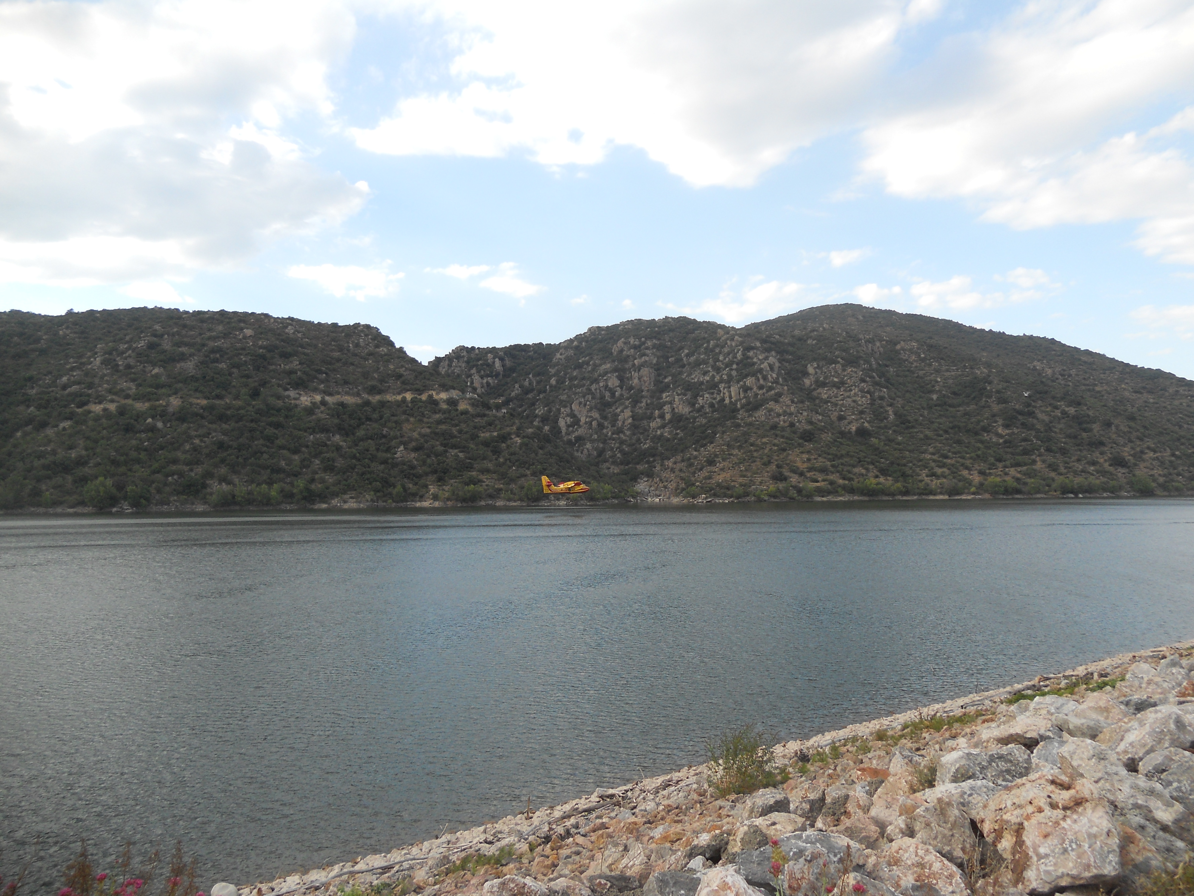 Canadairs of Canadères zijn blusvliegtuigen. Toevallig zag ik er gisteren drie in actie op het meer van Vinça. Een na een scheerden ze over het meer en zogen zich vol water. Daarna gingen ze blussen in Trevillach. De foto’s zijn wat veraf, maar het was best spectaculair. En geruststellend ook. Trevillach is hier niet zo ver vandaan. En het is nog steeds warm en droog.